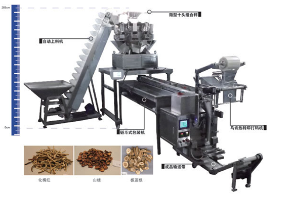 全自动称量包装机适用于中药饮片自动包装直径小于1.5cm且单粒重量小于0.5g均匀类无粘性物料自动化饮片小包装使用。也可用于膨化食品、糖果、花生、青豆、瓜子、大米、种子、小饼干、开心果、茶叶、果冻、水饺、汤圆、味精、咖啡、砂糖等散粒状物料的自动化包装。本套系统:可装配十头电脑组合称、DXDK包装机、斗式上料机、进口热转印(马肯)打码机、工作平台、成品输送机等。该机具有自动称量、落料、制袋、封口(打易撕口)、断切、打码(品名、规格、产地、生产日期、企业信息)等功能。